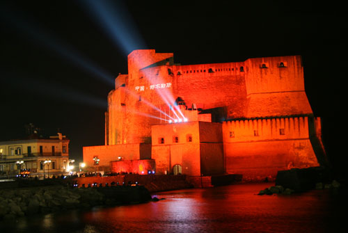 2月2日晚上,中国大使丁伟先生在那不勒斯著名的鸡蛋城堡,与那不勒斯市长共同按动激光按钮。霎那间,整个城堡披上了中国红,“中国——那不勒斯”六个大字投射在美丽的城堡上。