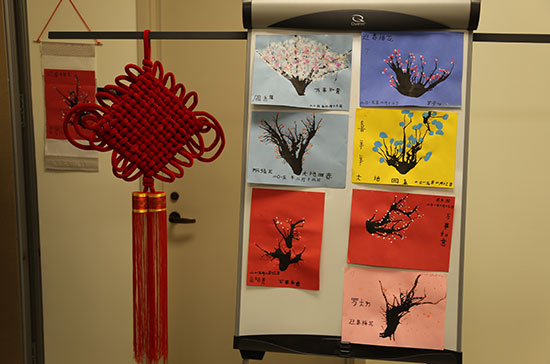 演出结束后,观众们意犹未尽,兴致勃勃地参观了学生们的吹墨梅作品展,在孔子学院中国书法、中国画、茶艺和古筝等摊位前近距离体验和互动。