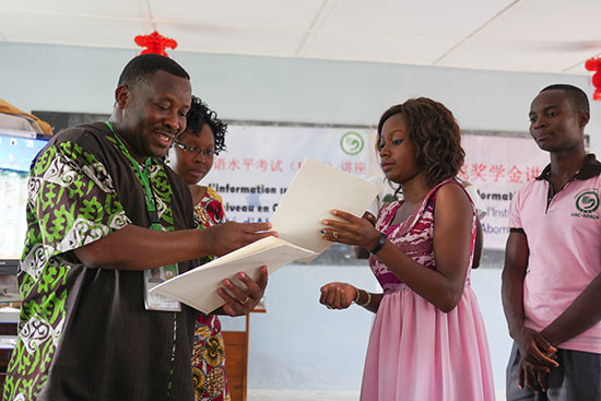 随后,中外院长颁发HSK证书,并为代表孔院参加尼日利亚“汉语桥”比赛取得大学组团体冠军的汉语专业尼日利亚籍学生颁发奖状和奖品,并为此次尼日利亚之行的带队和指导老师罗璐颁发优秀指导老师证书。