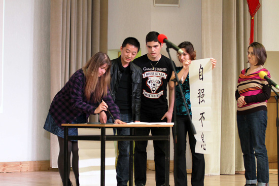 4月3日晚,保加利亚大特尔诺沃大学(以下简称大特大学)孔子学院在著名海边城市瓦尔纳举办“你好中国”文化节。在瓦尔纳经济大学学术活动中心,大特大学校长普拉门•列格斯科图普、大特大学孔子学院外方院长伊丝克拉、中方院长龙涛、孔子学院全体汉语教师志愿者,瓦尔纳经济大学副校长季米特洛娃和大学师生,以及对中国文化感兴趣的当地市民共400多人济济一堂,共同欣赏了中国武术、书法、舞蹈和中国传统服装,共同体验了第一节中文课。