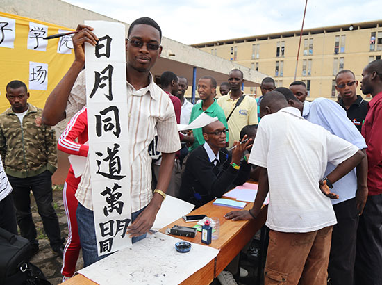 除布隆迪大学孔子学院教师之外,孔子学院学生也直接参与招生,他们现场展示自己的书法作品,积极传播中国文化。