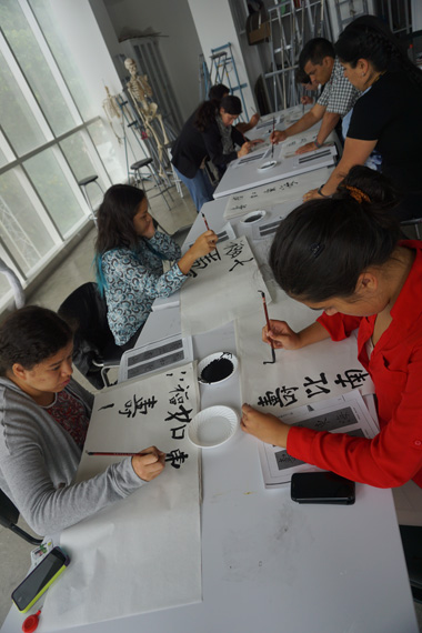 27日的书法课共计有三十名学生参与体验,教师从汉字的起源、书法工具、握笔姿势等方面进行了介绍。虽然很多学生没有学过汉语,有的甚至是第一次接触汉字,但是在书法练习阶段大家非常认真,并根据自己对汉字和书法的了解进行了创作。最后,老师评出了一、二、三等奖,以示对学生的鼓励和认可。