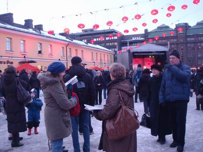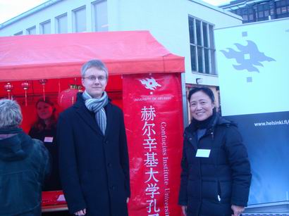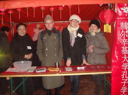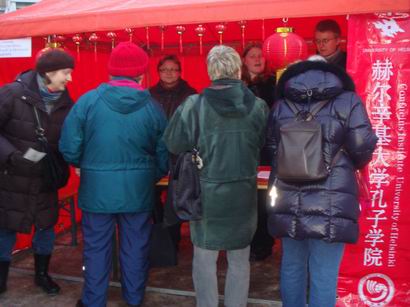 2011年2月2日,正值中国大年三十-除夕之夜,这是中国人最重要的节日。在赫尔辛基市中心广场,北京市与赫尔辛基市政府联合举办中国庙会。赫大孔子学院充分利用庙会人多的特点和地处闹市的优势来宣传介绍所开设的各种汉语和有关中国文化课程。庙会前,孔院多次专门开会研究部署参加庙会的具体内容,印刷小册子,准备布置摊位的宣传品等。