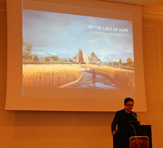 其后,米兰世博会中国国家馆设计师陆轶辰先生为大家展示了米兰世博会中国国家馆的设计理念和主题:“希望的土地”,中国馆所代表的中国文化及场馆建设情况。在场的观众都被中国馆新颖的设计理念,独特的采光所吸引而爆发出持久的掌声。