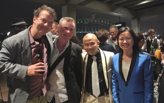 从右到左,金杏与孙悟空,猪八戒和沙和尚扮演者在庆功酒会上