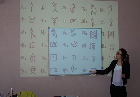本次活动分为两个部分。首先,主讲教师张娜梅用“击鼓传花”用汉语做自我介绍的小游戏方式拉开汉语角的序幕。在热身小游戏之后,张老师为大家展示、讲解了汉字的起源、发展,不同字体的书法作品,以及“文房四宝”的名称、作用和用法。