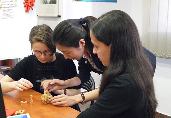 在汉语教师的指导下,参与者以小组形式进行益智玩具比赛。