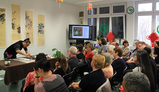 4月10日,孔院又开展了书画和太极的体验课。书画课上,杜俊立老师介绍了书画课的相关内容,展示了中国的文房四宝——笔、墨、纸、砚,这些都使听众们感到新奇不已,最后杜老师一气呵成的书法作品更是引发了大家参加书画班的兴趣。太极拳的主讲教师陈友凯出身于太极世家,他讲解了太极拳的由来、特点和功能,以及其中包含的中国传统哲学思想——阴阳相合,天人合一。陈老师特别指出,太极拳不仅可以健身,还可以用于实战,他和孔院志愿者洪海沛展示了这些有实战意义的动作,精彩的演示令观众赞叹不已。