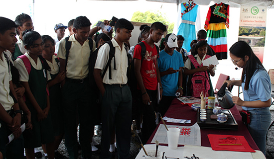 圭亚那大学“开放日”,也称“事业日”,是圭亚那大学最盛大的活动之一。活动旨在向当地学生介绍圭大的学科设置、社团活动、入学要求以及就业动向。圭亚那大学孔子学院精心布置展位,以纸板人、中国结、灯笼、书法及绘画、民族服饰、传统乐器等中国元素营造出独特的异国文化氛围。