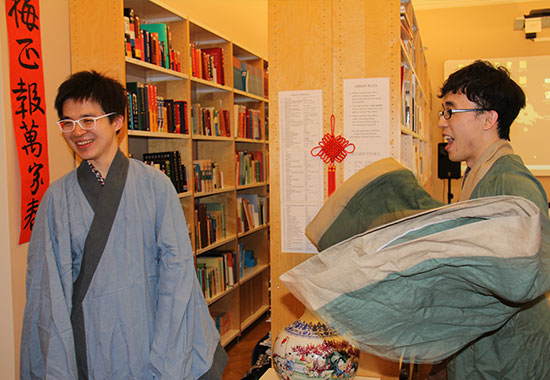 紧接着,学生们开始试穿汉服,在中国留学生和孔院教师的帮助下,他们认真地学习系带、交领、戴帽等穿衣技巧。很多学生说,穿上汉服之后,他们不自觉地感觉自己有“中国风”了,走路说话都充满了“中国范儿”。他们学习了一些见面时的礼仪,并和中国留学生们进行交流。