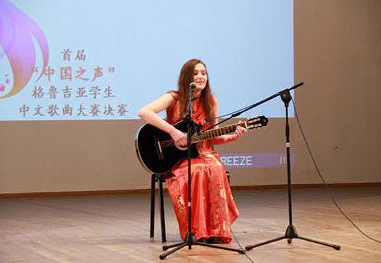 第比利斯国立大学汉语初级班的科利维泽,以一曲脍炙人口的《在那遥远的地方》拉开比赛序幕。她身着旗袍,自弹自唱,纯正的汉语发音和稳健的台风赢得了观众热烈的掌声。接下来,《传奇》《踏浪》《送别》《中国话》《同桌的你》《我的歌声里》等经典歌曲在格鲁吉亚汉语学生的精彩演绎下,异彩纷呈,其中浓浓的中国味和恰到好处的情感流露令人叫绝。选手们在表演形式上也别出心裁,巧妙借用钢琴、吉他、舞蹈、Rap说唱等艺术元素增加舞台效果。一番争奇斗艳之后,来自第比利斯53学校的果尔若拉泽以优美动听的《茉莉花》,摘得本次大赛桂冠。