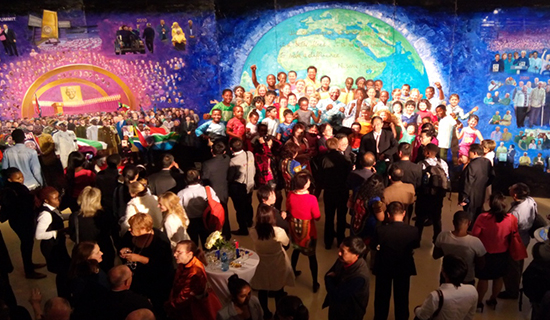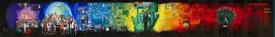 由中国艺术家李斌创作的这幅长卷史诗油画《曼德拉》,长38米、高3.8米,由“囚徒”(Prisoner)、“总统”(President)与“和平使者”(Peace-maker)三部分组成,基本按照曼德拉的人生经历从右往左以赤橙黄绿青蓝紫展开,形成彩虹图谱,象征南非“彩虹之国”的美誉。彩虹中镶有三块绿宝石:罗本岛、南非版图、有非洲大陆的地球,由暗变亮。