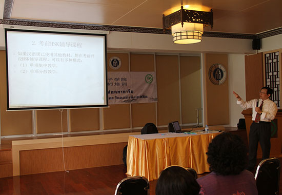 讲座中,刘谦功教授讲授了《汉语综合课教学法》和《汉语听说课教学法及教材使用》方面的问题,以生动案例帮助大家更快理解;刘超英教授则以《新HSK考试大纲与汉语教学》和《新HSK备考》为主题展开演讲,呼应了当前汉语水平考试在泰国中小学蓬勃发展的现状,并指导了各位教师的备考技巧。