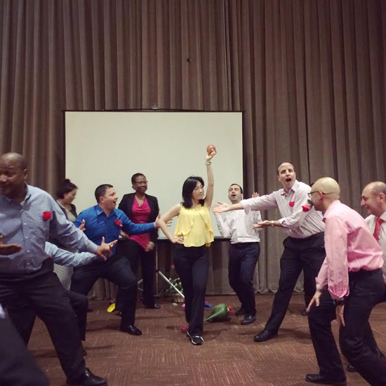 经验交流会之后,大家观看了一场集歌舞、乐器弹奏于一体的联欢会,由联合国中文组老师岳岩博士主持。这场联欢会节目包含了苗族歌曲、吉他弹奏、古筝表演、中国古典舞、西方Tango舞等。特别是其中的歌曲《对不起,我的中文不好》、Tango表演和歌舞《小苹果》,是由联合国中文组的岳岩老师、张蒙源老师及旅美知名青年艺术家李依凌带领中文组的学员利用午休时间,自编自演的,大家脸上开怀的笑容,优美的发音,动感的舞步,把整个现场气氛活跃起来推向了高潮,全场人都欢呼和参与起来,跟着和唱跟着摇摆。