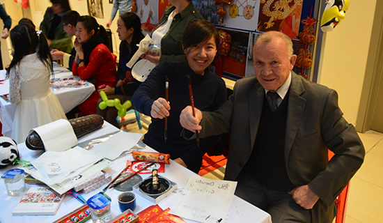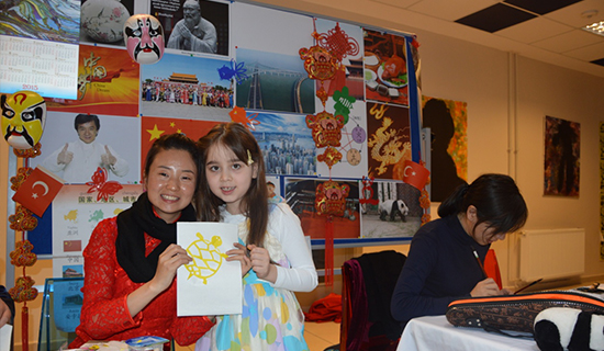 该校的师生和家长们首先观看了孩子们排练的歌舞表演,6名身穿五星红旗T恤的学生演唱了中国流行儿歌《小星星》,家长们纷纷起身鼓掌。随后,孩子们和家长一同观看了由孔院教师准备的文化展览,剪纸、书法等传统艺术引得大家纷纷驻足观赏。有的教师用毛笔给孩子写下他们的中文名字,有的教师教孩子们剪纸,有的教师教大家绘制京剧脸谱。教师们还将一些从中国带来的精美礼物赠给孩子们,活动在欢声笑语中结束。