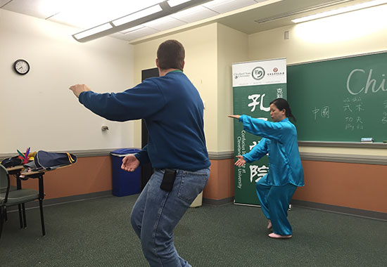 “体验中国”环节,老师与学生站成一圈,崔老师带领大家体验武术的基本功动作——手法、拳法、步法。练习中,大家体验了出臂、推掌、出拳和蹲马步等动作。马步是武术训练的基础之一,既可以锻炼身体的协调与肌肉的控制,还能磨练意志品质。它看似轻松,实则不易,一分钟不到,每个人都呈现出了各种“窘状”,大家也深深体会到习武之难。