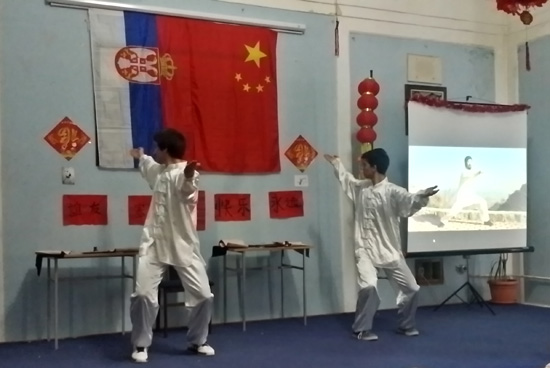 活动的中间环节是太极拳及剑术表演以及中国的民歌演唱。塞尔维亚学生表演的太极拳及剑术,展现了中华民族的武术文化——阳刚之气,令现场观众惊叹不已。志愿者教师与塞尔维亚学生共同演唱的民歌《茉莉花》,为现场观众展示了中华民歌的舒缓乐律之美,现场掌声不断。