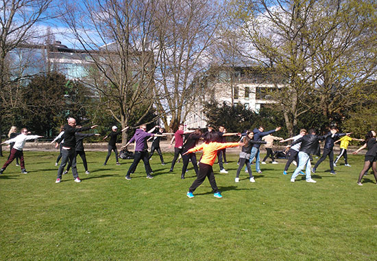 哥本哈根商务孔子学院项目主管Jonas介绍了孔子学院开展汉语和文化活动的情况。随后,武术志愿者教师单正午给来访的师生上了一堂中国功夫体验课,师生们跟着单老师的一招一式,在欢乐中体验了中国功夫的精气神。