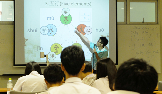 毕业于温州医科大学的孔院教师石少华是药理学硕士,他深入浅出地讲解了中医的发展历史、起源、基本理论、诊疗方法,以及中药等相关知识;阴阳、五行、穴位、针灸、拔罐等文化知识和理论内容都有所涉及;石老师还现场指导学生们初步感受了中医推拿。