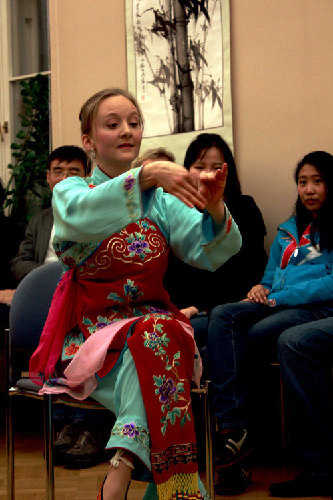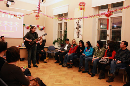 新年晚会上,金发碧眼的芬兰姑娘舞着长袖,惟妙惟肖地唱着京剧;潇洒的芬兰小伙弹着吉他深情演唱着中国流行歌曲;身着苗族服饰的中国姑娘们跳着淳朴美妙的民族舞蹈……