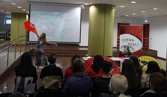 孔院志愿者李丽从扇子的历史渊源、文化内涵以及中西对比等几个方面对中国的扇子文化展开讲述,现场观众了解到扇子不仅可以引风纳凉,还能体现出艺术家的个人情怀,是书画名家们笔墨情趣的表现,大家都惊异于中国扇子深厚的文化底蕴。