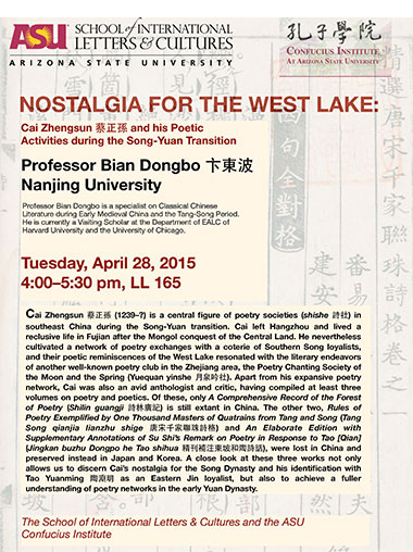4月28日,南京大学文学副教授应亚利桑那州立大学孔子学院和国际语言与文学院邀请做了题为“西湖的怀旧之情——宋元易代时的蔡正孙和他的诗歌活动”的专题讲座。