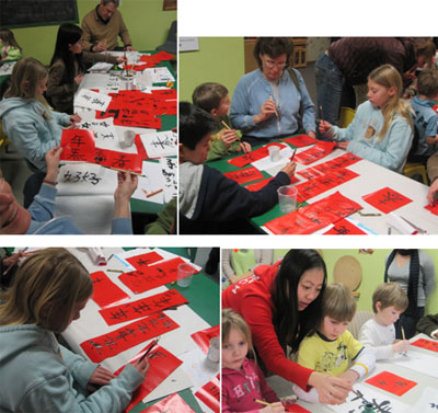 孔子学院的老师们先介绍了春节的来历和中国人过春节的各种传统习俗,并在黑板上教孩子们如何写“新春快乐”等新年词语,然后分发纸墨,孩子们和家长们都兴奋地在大红纸上照葫芦画瓢。在各位老师和家长的帮助下,小家伙们都圆满完成了任务。孔院老师还教孩子们用汉语唱新年好的儿歌。 孩子们最喜欢的环节之一就是动手折纸,彩色的小船,可以充气的纸兔子,画上眼睛马上活灵活现。