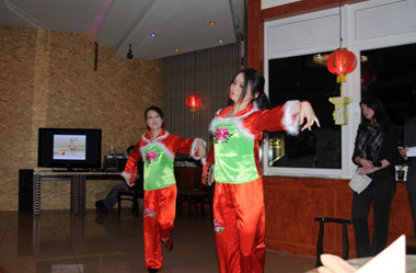 听着优美的古筝曲,大家开始吃“年夜饭”了。虽然是远在德国,但是节庆气氛却十分浓烈,年夜饭也是有滋有味,不仅有春节必吃的饺子,有象征着“年年高”的年糕,有中国著名小吃之一汤圆、还有水煮鱼、宫保鸡丁,扬州炒饭等中国菜肴,不仅让思乡的华人饱了口福,也让很多第一次尝试中国菜的外国人直树拇指,同时这也是同事之间、尤其是教师和学员之间一个绝好的交流机会。