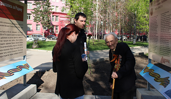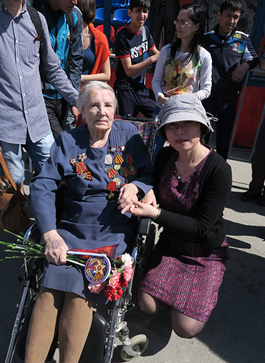 孔院师生在院长的带领下,向老战士和烈士后代赠送鲜花,向他们表达中国人民对英雄诚挚的敬意;他们得知送花人是中国孔院的院长和学生时,都非常感动,他们说:“中国和俄罗斯是朋友,战争年代是,和平时代是,永远是!”