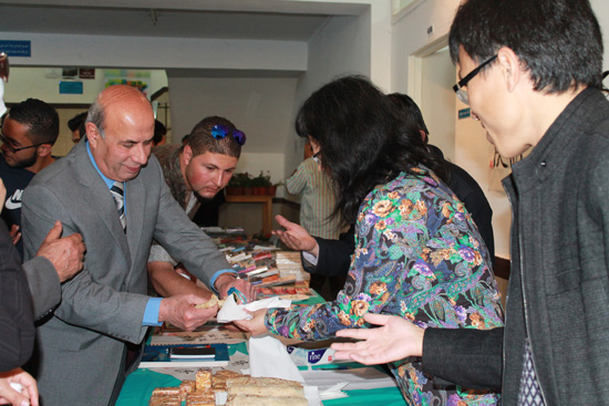 本着“立体、多维,睹物思远,观赏与体验结合,精神与美食同光”的设计理念,孔院展示了中国美食、十字绣、中国书法、中国剪纸艺术与文化等。同时,利用电视,循环播放了大量展示中国山川大美的自然与人文图片。孔院老师自制的煎饼果子,购自中国超市的沙琪玛等中国点心,让费大师生品尝了中国味道;十字绣、中国剪纸大放光彩,不由人不驻足流连,叹赏不止,并向孔院老师询问、了解有关的知识,又很高兴地观看了制作工艺。中国书法一直深受约旦师生喜爱。很多学生欣然要求用汉字写下自己的名字,作为艺术品收藏。有的还要求用毛笔把自己的名字写在胳膊上。许多同学特意在孔院院旗和展示中国风光图片的电视前拍照留念。