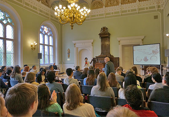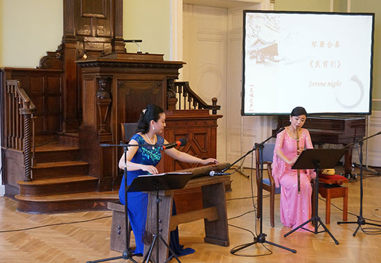 为了帮助外国观众们更好的欣赏中国古典音乐,林教授还贴心的为每首曲目准备了浅显易懂的背景讲解。在近两个小时的演出中,来自中国民族乐团的古琴演奏家邓红和笛箫演奏家陈莎莎用她们娴熟精湛的技艺、丰沛酣畅的感情为大家表演了古琴、埙、箫、木鱼等中国传统民族乐器。观众们一饱耳福,欣赏了《流水》、《阳关三叠》、《平沙落雁》、《梅花三弄》、《苏武牧羊》和《钗头凤》等11支中国古典音乐曲目。流畅优美、清新飘逸的旋律在礼堂上空久久飘扬,观众们听的如痴如醉。