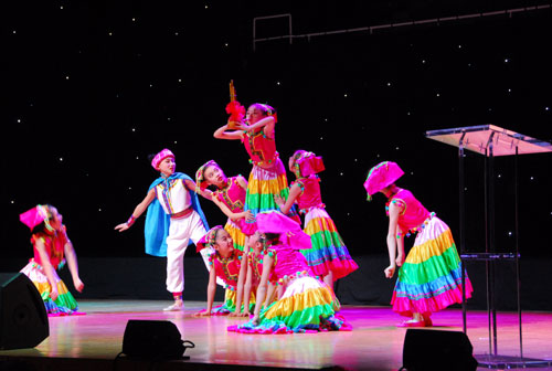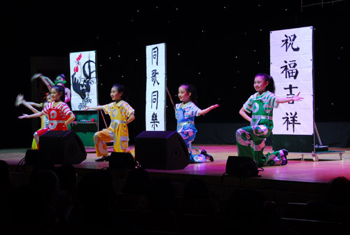 晚会由都柏林大学孔子学院的女教师李晓东和专程从北京赶来的爱尔兰艺人董默涵共同主持。李晓东流利漂亮的英语和董默涵字正腔圆的北京话,让全场观众实际感受到中爱语言文化交流的成果和魅力。爱尔兰Loreto女子中学学生演唱的《歌声与微笑》为精彩的文艺演出拉开序幕,蜚声海内外的南京小红花艺术团的孩子们以《兔年吉祥》的开场歌舞为晚会定下红火欢快、新鲜童趣的基调。都柏林大学商学院商务与中国学专业四年级学生演唱的中文歌曲《童话》,原汁原味,赢得了观众阵阵叫好。 最后,小红花艺术团表演的《小小艺术家》为晚会掀起了高潮。伴着悠扬的歌声和欢快的舞姿,四个孩子当众挥毫,表演了书法与绘画绝技,令爱尔兰观众为之倾倒,一遍遍地鼓掌欢呼。