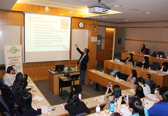 白教授介绍了美国对外汉语教学的现状。他说,现在学习汉语的美国学生人数逐年上升,并呈低龄化、多元化和专业与汉语复合化趋势。在这种新情势下,中文教学中的最新发展模式——主题式教学法应运而生。本次培训围绕主题式教学模式的特征、理论依据及其在华语教学中的实际应用这三方面展开,内容涵盖对外汉语教学基本理论知识、课程及教学活动设计,学习成果评估等。在每个方面讲述后的互动环节中,教师们结合自身教学实际,围绕白教授的主题式教学,提出诸多思考和问题。