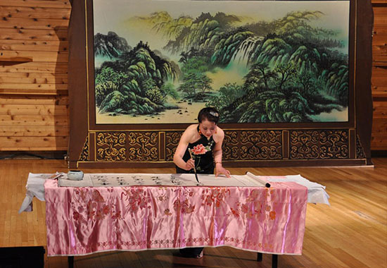 紧接着,独特新颖的书法京剧表演将两种截然不同但又彼此相通的中国传统艺术形式完美地结合在一起,表演者现场泼墨挥毫,同时吟唱苏东坡的诗作《颂西湖》,博得现场阵阵掌声;《霸王别姬》再现梅派经典唱段,青衣与花脸共同演绎项羽与虞姬缠绵悱恻的爱情故事。