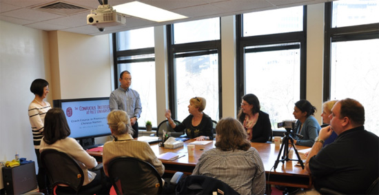 4月21日,论坛在孔子学院会议室举行,中方院长朱敏博士和项目主管王琦祺老师首先致欢迎辞,热烈欢迎佩斯大学国际学生学者办公室主任Mira Krasnov女士等15位负责国际交流事务的工作人员以及多位承担中国学生课程的教授。然后,朱敏博士和王琦祺老师开展题为“中文姓名和读法”的讲座。讲座谈到了中美姓名的差异、中文姓名的主要形式等内容,重点在帮助听众学习常见中文姓名中比较难的一些发音,最后帮每个参加者取一个中文名字并教会发音。讲座全程大家提出了很多问题,对发音练习更是兴致盎然。纷纷表示,这样的活动可以让他们为佩斯的中国留学生提供更贴心的服务。