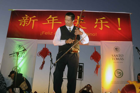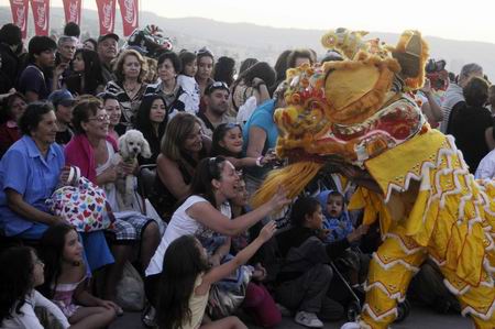 演出一开始,一曲古朴的二胡乐曲将现场观众带入了神秘的东方意境,这种独具东方特色的乐器还不为智利人所熟知,但音乐无国界,观众们无不为东方音乐特有的魅力所折服,一曲终罢,掌声雷动。来自当地武术学校“中华文化中心”的师生给大家表演了太极扇、长拳和散打套路等,或行云流水、写意风流,或真枪实刀,威风赫赫,精彩而不乏艺术韵味的武术表演将现场气氛推上了高潮。接下来,来自圣地亚哥的中华威风鼓队衣著靓鲜,动作整齐划一,表演一经亮相就获得了满堂喝彩。锣鼓表演是一种流行在中国北方的民间广场艺术。随后的中国龙狮舞蹈、新疆舞、牧养曲演唱等节目将中国新年的喜庆气氛演绎得淋漓尽致。新年演出在中国南方狮舞表演中拉下帷幕。表演结束时现场观众仍然意犹未尽,很多人问到兔年的含义、中国人过新年的习俗等问题,都想更多地了解中国文化。