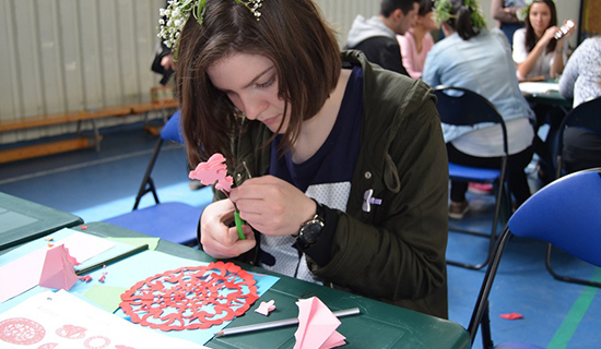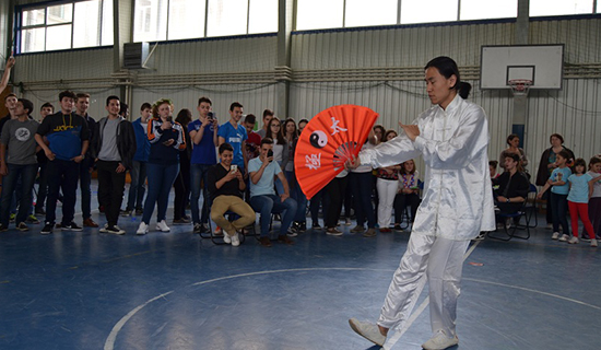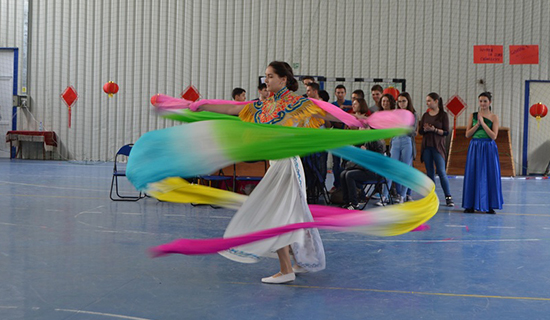 活动现场,首先吸引学生的是由孔院学生带来的集体舞蹈《小苹果》,动感的音乐和舞步体现出时下中国人的时尚和热情;紧接着,轻盈灵秀的传统舞蹈孔雀舞和彩带舞展示了中国传统舞蹈的魅力和灵性,现场掌声不断,喝彩连连;最引人注目的是汉语教师志愿者马骏表演的太极功夫扇演,不少男学生都跃跃欲试。此外,孔院还准备了剪纸教学、书法赠字以及筷子游戏等活动,使学生既能学习到相关文化知识,又能感受到学习汉语的快乐和趣味性。