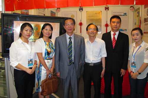 李春华大使和何源参赞与邢献红院长及展区工作人员合影