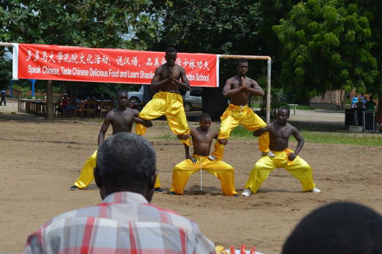 在中学校长发表了开场讲话,鼓励更多的学生参与到多多马大学孔院的中文、武术课程及文化活动中。随后,孔院武术教练带领众弟子呈现了一出精彩纷呈的武术表演。刀、枪、棍、棒轮番上演,现场观众大呼过瘾,更有目前已参加武术训练的中学学生加入到表演中来,向众人做了一次精彩汇报。