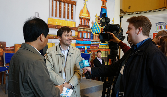 随后,著名翻译家叶果夫、娜塔莎和马雅茨基代表圣大东方系翻译团队致辞,就翻译过程中的体会与观众进行交流。在互动问答环节中,嘉宾们与现场观众展开了热烈讨论。俄罗斯“和平”电视频道等媒体纷纷关注并采访了此次活动。
