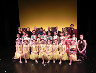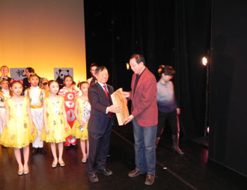 演出结束后,诺丁汉大学的校、院领导走到舞台上,和演员们亲切握手,祝贺演出成功,并和全体小演员合影。随后,孔子学院院长姚教授同南京小红花艺术团团长祁坚达互赠了礼物。