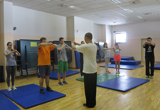 学生们在聆听、模仿和练习中,学习太极拳对呼吸和力量的运用,感受太极拳以静制动、动静结合的风格,逐渐了解太极拳的精髓。两人一组的自我防御技能操练掀起了课堂学习的高潮,让学生收获颇丰。