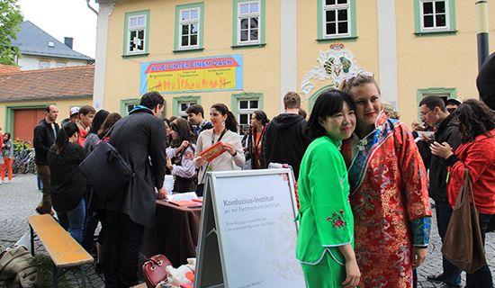当天,伊尔梅瑙韦茨拉尔广场上聚集了来自世界各地的学生。在这里,人们可以品尝世界各国的美食,领略异国风情,还能看到各国学生表演的精彩节目。埃尔福特孔院展示了中国文化的特色项目,如剪纸、民族服饰以及中国传统食物茶叶蛋和桂花汤圆。