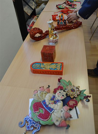 随后,Kaminski教授展示了一卷印有屈原诗作《离骚》的竹简。端午节是中国汉族人民纪念屈原的传统节日,中国人会通过吃粽子、赛龙舟、挂蒿草、熏艾叶和喝雄黄酒等习俗缅怀这位伟大的诗人。Kaminski教授还带来了许多中国传统刺绣,比如印有“五毒”图案的小儿肚兜。Kaminski教授解释道,中国的长辈将这些面目可憎的毒虫图案修在孩子的衣服上,象征着驱除毒害、平安健康。一同展示的还包括以赛龙舟和包粽子等为主题的年画,好奇的维也纳听众争先传阅这些展品,一方面为精美的刺绣技术所倾倒,一方面更感叹中国的悠久文化。