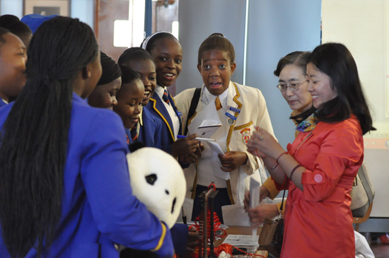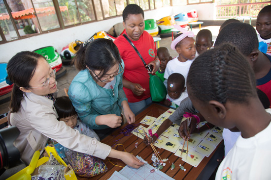 这些孤儿年龄从两岁到十岁不等,有的甚至还不会说英语,只会说当地的绍纳语,但是在孔院志愿者们的带领下,他们激动地用中文说出了“谢谢”,充满童稚的欢笑和一声声嘹亮的汉语此起彼伏,是那样和谐而动听。离开前,他们纷纷簇拥着津大孔院布置的中国文化展台,看看美妙的中国画,摸摸喜庆的红剪纸,学习用筷子夹糖果……恋恋不舍。就这样,面对一波又一波造访的小朋友们,志愿者们用自己的爱心与耐心带领孩子们初步领略了美妙的中国文化。
