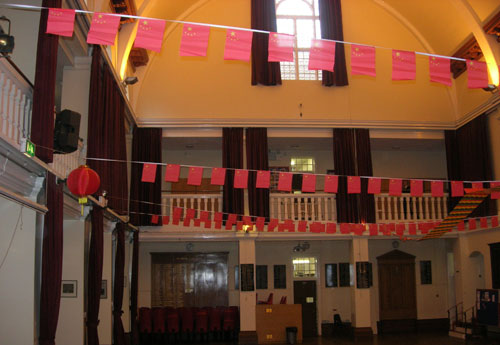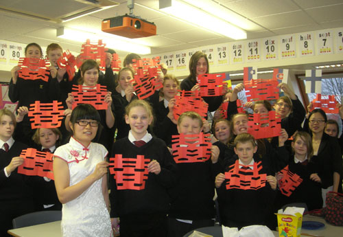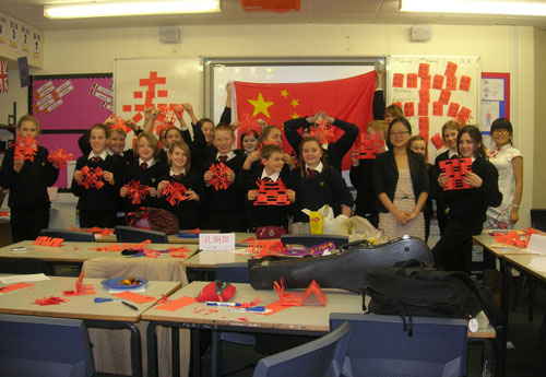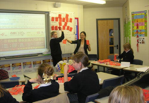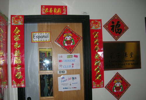 2011年2月2日,大年三十。英国专长学校联合会国王爱德华七世高中孔子课堂和学生们一起迎接中国新年的到来。一走进国王爱德华七世高中的主楼大厅,就可以看到大厅的上方悬挂着一面面中国国旗,一条中国龙,还有两盏大红灯笼。欢乐喜庆的一片红告诉全校的师生们:中国新年到了!孔子课堂的两位汉办老师,许佳慧老师和王艳艳老师,特意给全校的老师发了封邮件,与他们共同分享新年的喜悦。校园里,认识和不认识我们的学生们碰见了都会热情地跟我们说:“新年好!”