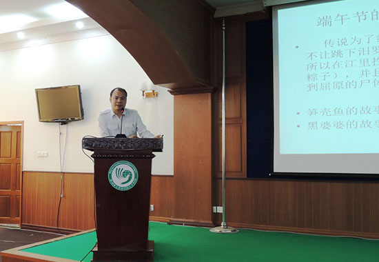 随后,帅式毅院长做了《中国传统节日介绍——端午节》的讲座。他介绍了端午节的由来、风习及庆祝活动,同时用比较的方式联系了柬埔寨的节庆活动。他说,中柬两国文化交流源远流长,两国风习有很多相同的地方。希望学员们通过参加中国文化活动来加强汉语学习,也希望学员们在将来能用中文把柬埔寨的传统节日柬新年、亡人节、送水节等介绍给中国朋友。