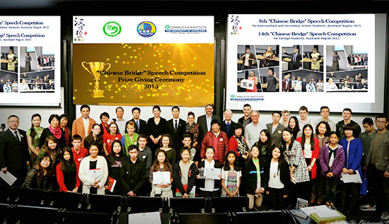 2015年“汉语桥”世界中文比赛奥克兰赛区预赛于5月2日在奥克兰大学举行,最终来自奥克兰大学的Thomas Nicholls获得大学组冠军,来自西湖男子高中(Westlake Boys High School)的Rengen Parlane获得高中组冠军,来自ACG帕内尔中学(ACG Paell College)的学生Ahyeong Lee获得初中组冠军。
