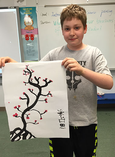 汉语教师翟朝云介绍了中国画的历史、分类、工具与绘画特点,学生通过现场展示的国画作品“喜上梅梢”‘“竹报平安”与西方绘画进行了对比,“用纸不同”,“用的笔不同”,“中国画有印章”……学生们每找到一处差异就欢呼雀跃,现场气氛热烈。当他们观看了北京奥运会开幕式关于宣纸的视频后,亲手触摸到宣纸、毛笔和墨块时,连呼“太酷了”,迫不及待地想要挥毫作画。