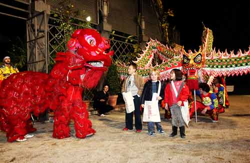 随后进行的是一场专业的舞龙舞狮表演,伴随着欢乐喜庆的锣鼓声,一头醒狮时而施礼,时而奋起,紧接着一条游龙跃出,在人们的视线里翻滚盘旋,精彩逼真的表演赢得了大人和孩子们的阵阵喝彩。
